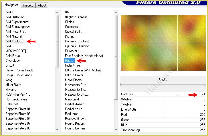 4 - Calques/Dupliquer **Effets/VM Toolbox/ Grid réglages suivants :