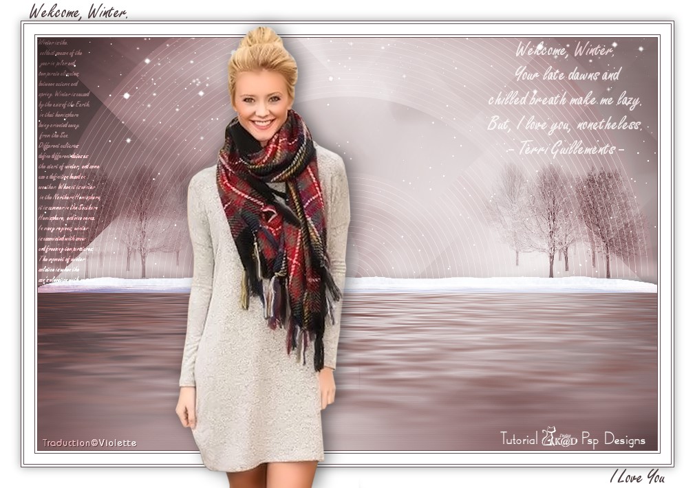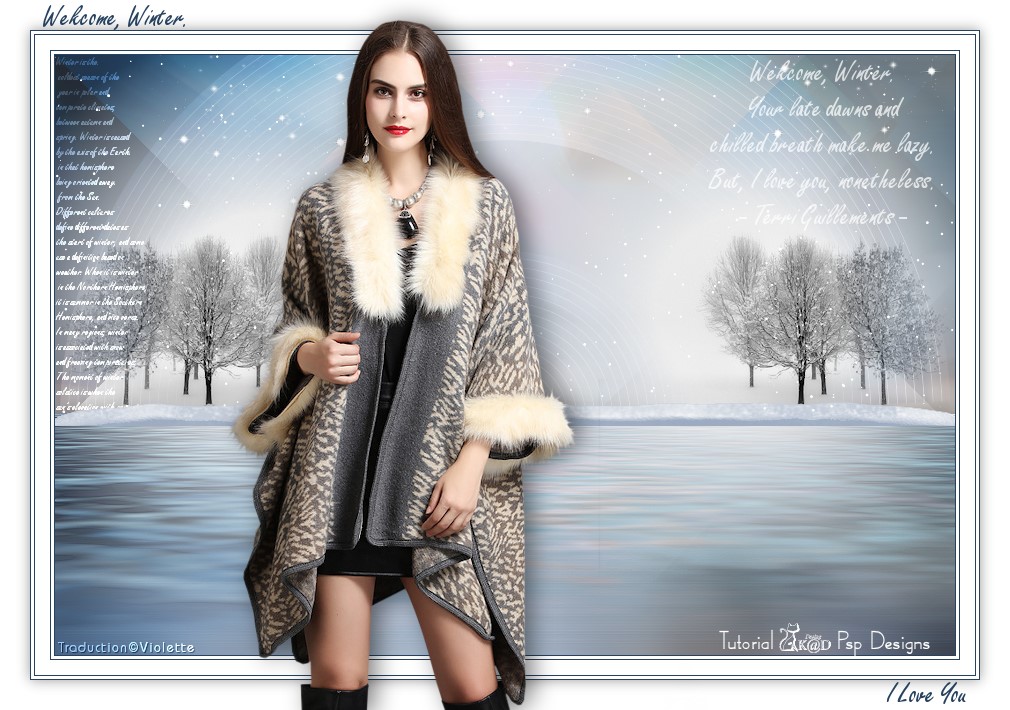Merci beaucoup à Karin de m'avoir donné l'exclusivité de la traduction française de ses tutoriels*** *** Ces traductions m'appartiennent Il est strictement interdit de les copier ou de les distribuer sur le Net Les tutoriels sont la propriété de leurs auteurs *** 423 - Welcom Winter vous trouverez l'original de ce tutoriel ICI *** Ce tutoriel a été réalisé dans PSP X9 mais peut être effectué dans les autres versions PSP Ces traductions m'appartiennent Il est strictement interdit de les copier ou de les distribuer sur le Net *** Pour faire ce tutoriel vous aurez besoin : Tubes : KaD_WinterWoman20 423_KaD_WinterTrees 423_KaD_Snow 423_KaD_Text1 / 423_KaD_Text2 / 423_KaD_Text3 Background : 423_KaD_Achtergrond Masques: Marge_TopFade Preset : 423_Preset_Flood ((double clic pour installer) Sélection: 423_KaD_Alfakanaal .pspimage *** Filtres : ICI Mehdi /Sorting Tiles AP01 [Innovations] /Silvelining MuRa's Meister /Pole Transformation