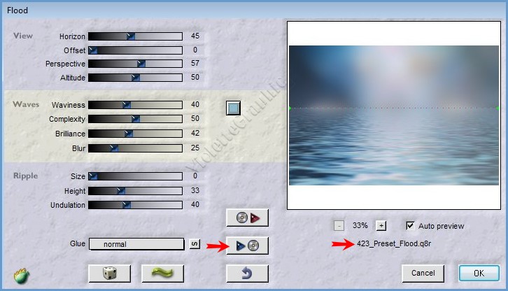 15 - Effets / Flaming Pear / Flood / réglages surivants Appliquer le preset 423_Preset_Flood .q8r couleur est #97b1c9 clic sur la flèche bleue et aller chercher le preset dans le dossier du matériel