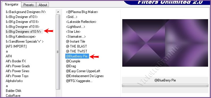 7 - Calques/Dupliquer **Effets / Unlimited/ & <Bkg Designer sf10 IV > / @BlueBerry Pie réglages suivants :