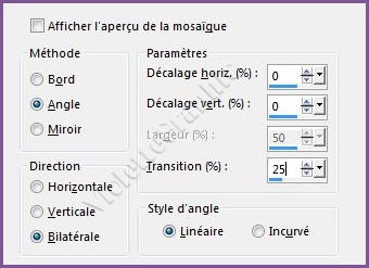 10 - Calques/Dupliquer Image/Miroir/Miroir horizontal **Calques/Fusionner le calque du dessous **Effets/Effets d'image/Mosaïque sans jointure réglages suivants: