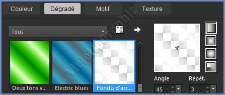 14 - Placer la couleur #ffffff en premier-plan Configurer un dégradé linéaire fondu de premier-plan : angle: 45°/Répétitions : 3/Inverser coché