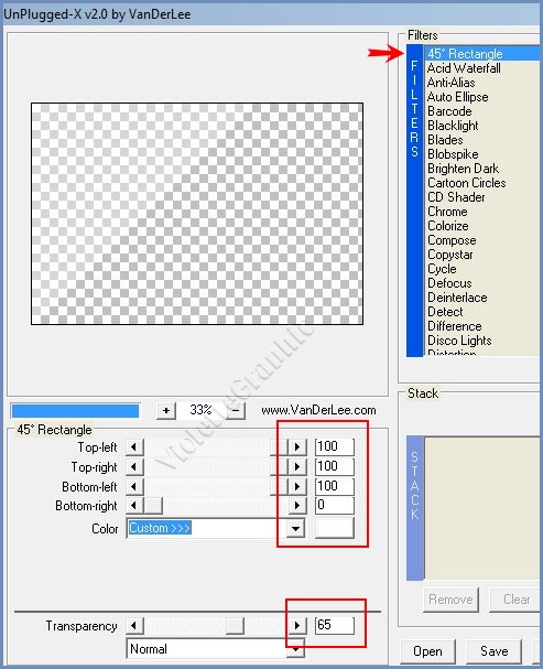 18 - Calques/Nouveau Calque Effets /VanderLee /Unplugged X /Rectangle 45 ° réglages suivants :