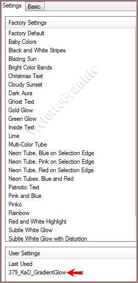 5- Effets/Graphic Plus/Cross Shadow réglages par défaut 4 - Effets/ Alien Skin Eye Candy 5 Effet / GradientGlow Appliquer le preset "379_KaD_GradientGlow" ![]() 5 - Image/Redimensionner à 75%/décocher " Redimensionner tous les calques"