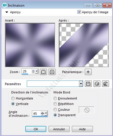 3 - Réglages/Flou/Flou gaussien : rayon : 50 **Calques/Dupliquer ** Effets/Effets géométriques/inclinaison réglages suivants :