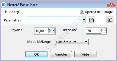 **Réglages/Netteté/Netteté Passe-haut réglages suivants :