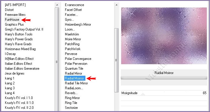 11 - Activer le calque 1 Calques/Dupliquer Effets/Unlimited / Funhouse /Radial Moirror réglages suivants :