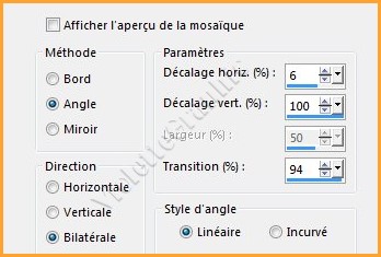 3 - Activer le tube KaD_MistedLandscape6.png Edition/Copier/Edition/Coller dans la sélection Sélection/Ne rien sélectionner Effets/Effets d'image/Mosaïque sans jointure réglages suivants : côte à côte