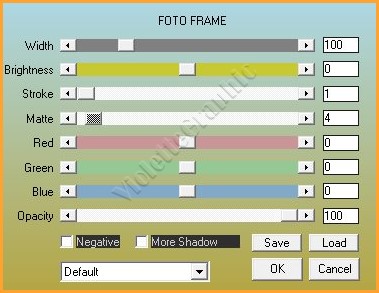 12 - Image/Ajouter des bordures : 2 pixels couleur noir Sélection/Sélectionner Tout Image/Ajouter des bordures : 20 pixels couleur blanc Sélection/Ne rien sélectionner **Effets/AAA Frame/Foto frame réglages suivants :