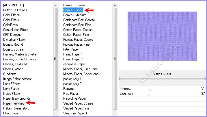 **Remplir de couleur premier-plan Effets/Unlimited 2.0/Paper Texture/ Canvas Fine réglages suivants :
