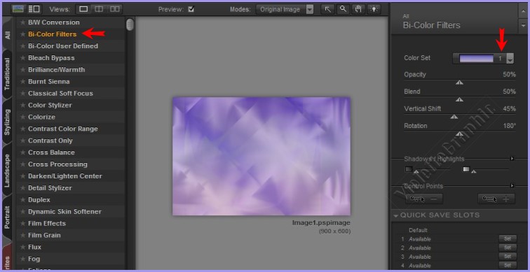 19 - Activer le calque 1 Calques/Dupliquer Effets/ Nick Color efex Pro/ Filtres Bi-Color réglages suivants: Violet / Rose - Set 1 Mode de fusion : Lumière Dure Opacité à 50% Calques/Fusionner le calque du dessous * Voir ce qui convient le mieux à vos couleurs