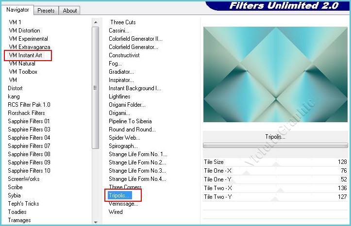 3 - Calques/Dupliquer Effets / Ulimited 2.0 / VM Instant Art / Tripolis réglages suivants :