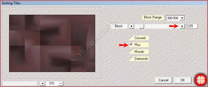 Mode de fusion : Recouvrement **Réglages/Flou/Flou gaussien : rayon : 20 **Calques/fusionner les calques visibles **Effets/Medhi/Sorting Tiles réglages suivants :