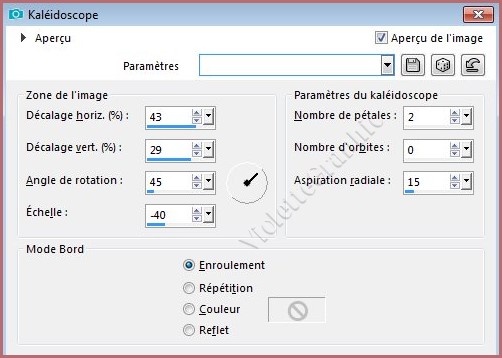 11 - Activer le calque supérieur ** Calques/Réorganiser/Déplacer vers le bas 2 fois Image/Miroir/Miroir horizontal **Effets/Effets de réflexion/Kaléidoscope réglages suivants :