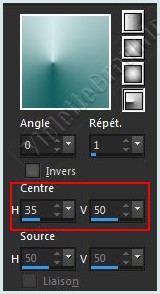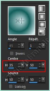 *** 1 - Ouvrir une image transparente de 800 x 500 pixels **Dans la Palette de Style Configurer un dégradé radial angle: 0°/Répétition: 1/Inverser non coché Centre: hor.=35/ vert.=50