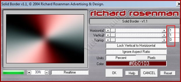 **Réglages/Flou/Flou gaussien : rayon : 30 **Effets/ Richard Rosenman / Solid Border réglages suivants :