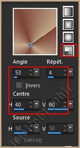 *** 1 - Ouvrir une image transparente de 800 x 500 pixels Remplir de dégradé radial/angle: 53/halo/Répétitions : 4/Inverser non cochéCentre: hor.= 40/ vert.= 80