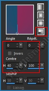 Dans la Palette de Style configurer un dégradé radial: 0°/Répétition: 0/Inverser non coché Centre: hor.= 40/ vert.= 100