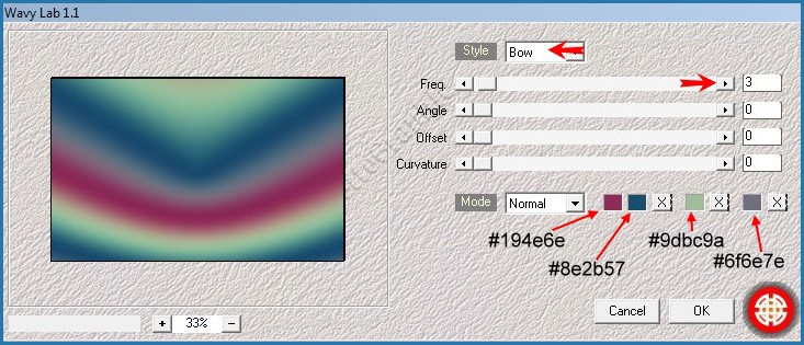 2 - Effets/ Mehdi / Wavy Lab 1.1 réglages suivants: #194e6e ... #8e2b57 ... #9dbc9a ... #6f6e7e