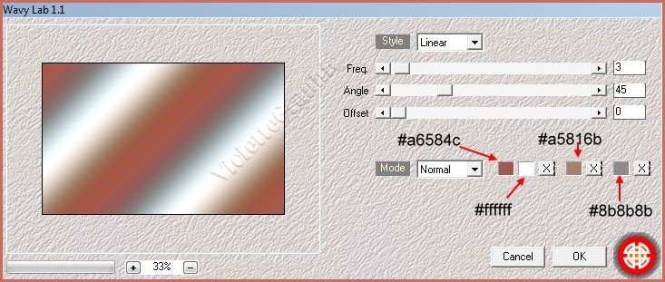 *** 1 - Ouvrir une image transparente de 800 x 500 pixels ** Effets/ Mehdi / Wavy Lab 1.1 réglages suivants:#a6584c ... #ffffff ... #a5816b ... #8b8b8b