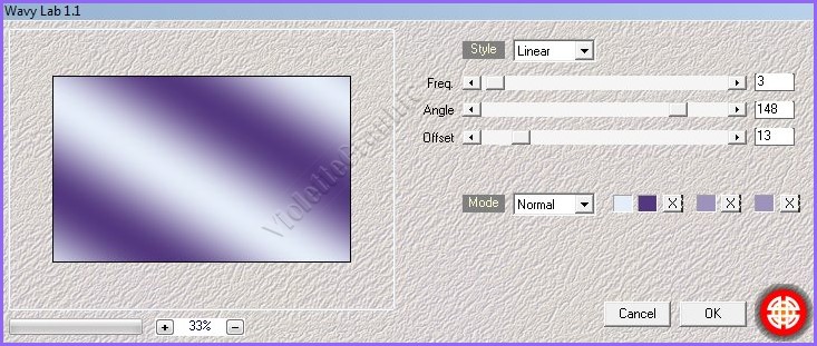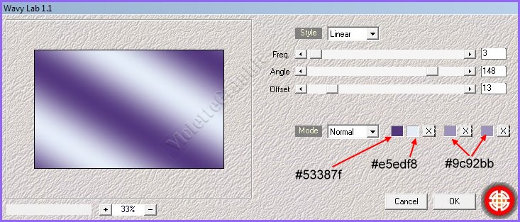 **Dans la Palette de style /inverser les couleurs Effets/ Mehdi / Wavy Lab 1.1 réglages suivants: #53387f ...#e5edf8... #9c92bb... #9c92bb
