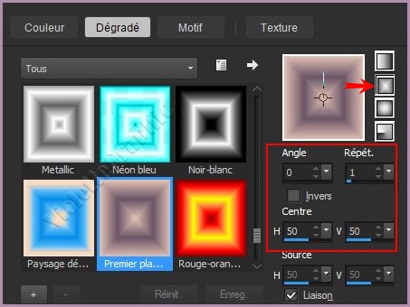 **Configurer un dégradé rectangulaire/angle: 0°/Répétition: 1/Inverser non coché Centre: hor.=50/ vert.=50
