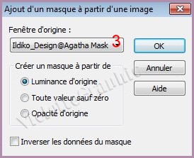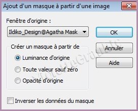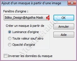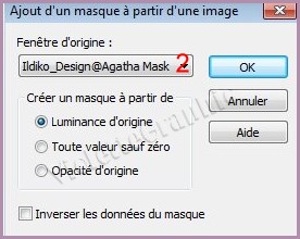 2 - Activer le masque Ildiko_Design@Agatha_Mask_1.jpg Calques/Nouveau calque de masque/à partir d'une image/Ajout d'un masque à partir d'une image sélectionner le masque Ildiko_Design@Agatha_Mask_1.jpg