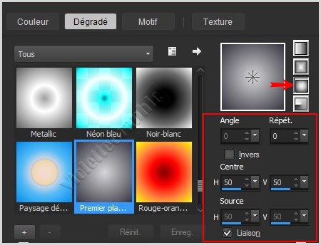 **Configurer un dégradé halo/Répétition: 0/Inverser non coché Centre: hor.=50/ vert.=50 case liaison cochée