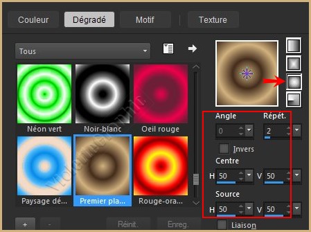 **Remplir de dégradé formé des couleurs premier-plan couleur #d1b17e/ arrière-plan couleur #452e1e configuré : halo/Répétitions : 2 Centre: hor.=50/ vert.=50 Source: hor.=50/ vert.=50
