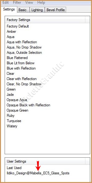 **Effets / Alien Skin / Eye Candy 5 Impact : Glass réglages suivants : **Appliquer le preset Ildiko_Design@Mabella_EC5_Glass_Spots