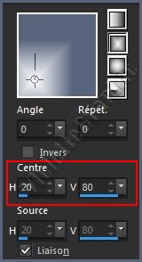 *** 1 - Ouvrir une image transparente de 900 x 500 pixels remplir de dégradé rectangulaire/angle: 0°/répétition : 0/Inverser non coché Centre: hor.=20/ vert.=80 Source : liaison cochée
