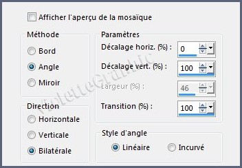 **Image/Retourner/Renverser horizontalement **Effets/Effets de Bord/Accentuer **Effets/Effets 3D/Ombre Portée : 0/0/50/20/couleur #000000Effets/Effets d'image/Mosaïque sans jointure réglages suivants: