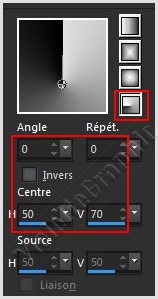 *** 1 - Ouvrir une image transparente de 900 x 500 pixels remplir de dégradé radial/angle: 0°/répétition : 0/Inverser non coché Centre: hor.= 50/ vert.= 70