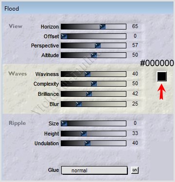 Remplir de dégradé ** Réglages/Flou/Flou gaussien : rayon : 50 **Image/Retourner/Renverser verticalement **Effets/Flaming Pear /Flood réglages suivants :