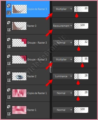 4 - Ouvrir le tube ildiko_design_linda_eye.pngEdition/Copier/Edition/Coller comme nouveau calqueObjet/Aligner/Bas Mode de fusion: Luminance Opacité à 28%