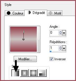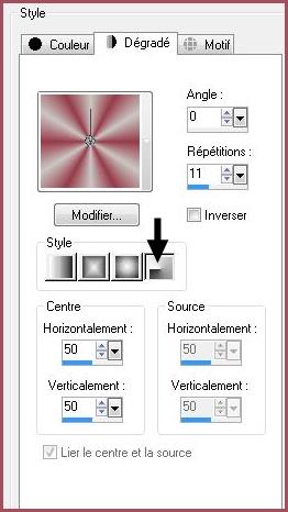 1 - Placer en premier-plan la couleur #cac6c3 et en arrière-plan la couleur #973b48Dans la Palette de Style Configurer un dégradé radial angle: 0°/Répétitions : 11