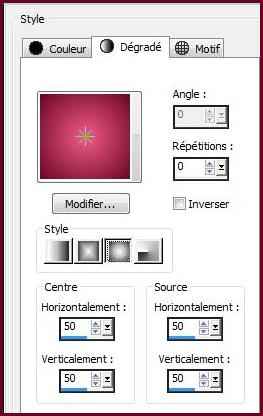2 - Placer en avant-plan la couleur #f25c86 et en arrière-plan la couleur #690521Dans la Palette de Style Configurer un dégradé halo angle: 0°/Répétition : 0