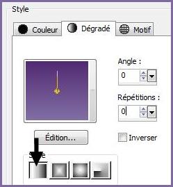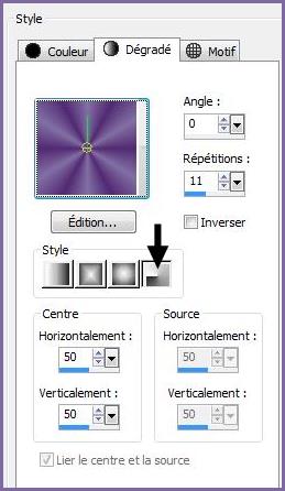 1 - Placer en avant-plan la couleur #816fa3 et en arrière-plan la couleur #522a73Dans la Palette de Style Configurer un dégradé radial angle: 0°/Répétitions : 11