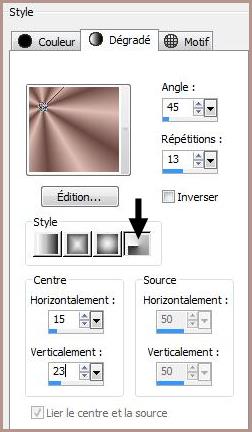 1 - Placer en avant-plan la couleur #debeb3 et en arrière-plan la couleur #694640Dans la Palette de Style Configurer un dégradé radial angle: 0°/Répétitions : 11