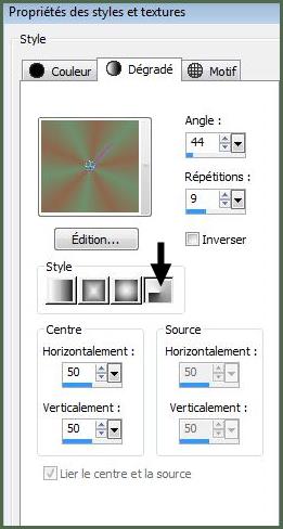 **Dans la Palette de Style Configurer un dégradé rectangulaire angle: 44°/Répétitions : 9