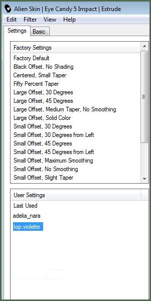 10 - Effets/Eye Candy 5 Impact/Extrude Appliquer le preset top_violette
