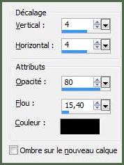 15 - Effets/Effets 3D/Ombre Portée : 4/4/80/15,40/couleur #000000 **Calques/Fusionner le calque du dessous
