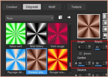 1 - Dans la Palette de StyleConfigurer un dégradé radial/angle : 0 /répétitions: 11 /inverser coché