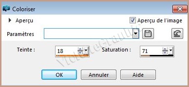 **Réglages/Teinte et Saturation/Coloriser réglages suivants :