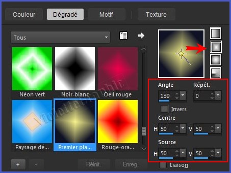 1 - Dans la Palette de StyleConfigurer un dégradé rectangulaire/angle : 139 /répétition: 0 Centre: hor.=50/ vert.=50 Source: hor.=50/ vert.=50