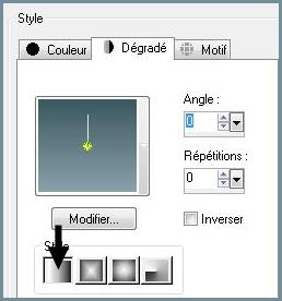 2 - Placer en avant-plan la couleur #89a0ab et en arrière-plan la couleur #3b585f Dans la Palette de Style Configurer un dégradé linéaire angle: 0°/Répétition: 0