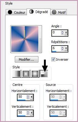 2 - Placer en avant-plan la couleur #f2b8bf et en arrière-plan la couleur #084f9f Dans la Palette de Style Configurer un dégradé radial angle : 0/Répétitions : 6 /case inverser cochée