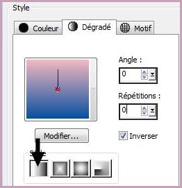 **Remplir de dégradé linéaire angle: 0°/Répétition: 0/Inverser coché
