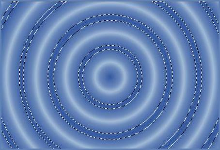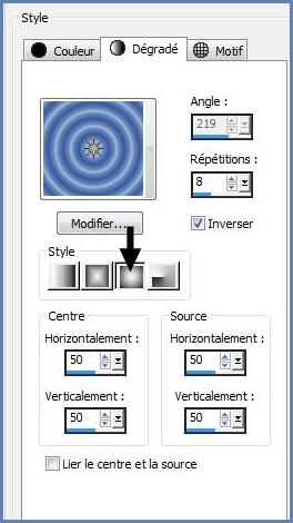 2 - Placer en premier-plan la couleur #9fb9d5 et en arrière-plan la couleur #355aa1 Dans la Palette de Style Configurer un dégradé halo angle: 0°/Répétitions : 8/Inverser coché