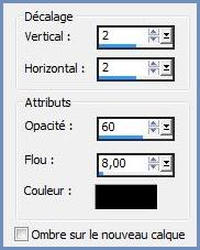 16 - Activer le calque supérieur Effets/Effets 3D/Ombre Portée : 2/2/60/8/couleur #000000